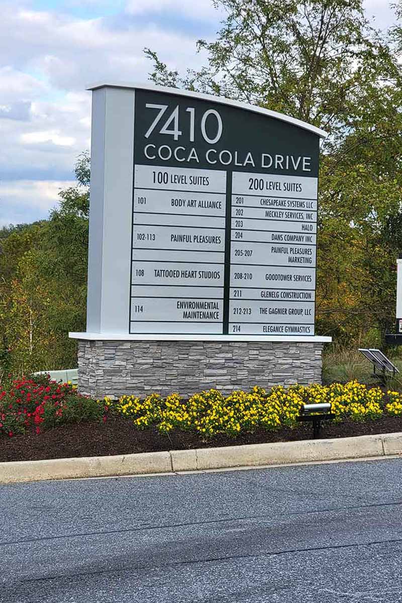 Project: 7410 Coca Cola Drive business park, exterior directory with interchangeable tenant names.