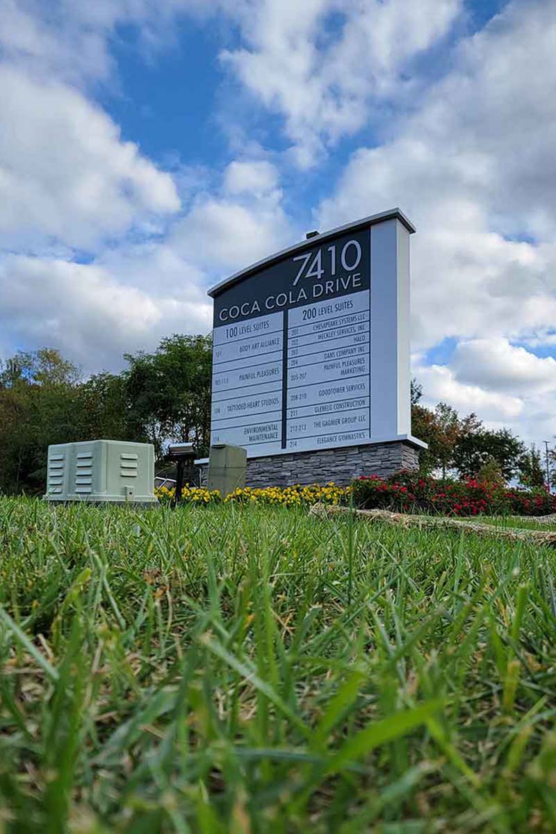 Project: 7100 Guilford Drive business park, exterior illuminated directory with interchangeable tenant names.